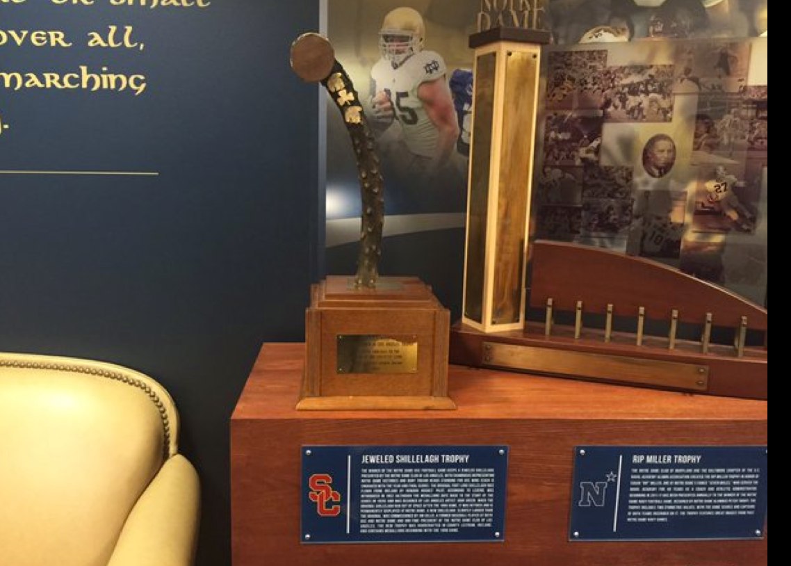 ГЛАВНЫЕ СОПЕРНИКИ USC TROJANS. Троянцы из Калифорнии - врагами воинственных ирландцев с 1926 года. Часто матчи между этими коллективами проводится в День Благодарения. В американском спорте большая честь проводить матчи в этот важный для каждого американца день. В очных противостояниях разыгрывается трофей Jeweled Shillelagh - по-русски нечто вроде «драгоценной дубинки» (возможны иные ассоциации, но я тут не причем), представляющей собой изогнутый толстый сук из ирландского дуба, чья ручка украшена золотыми листками клевера. На конце дубинки написано: «Из изумрудного острова». Этот нестандартный интересный трофей побывал у Файтинг Айриш 46 раз, 37 раз у Троянцев и в пяти случаях остался без хозяина.